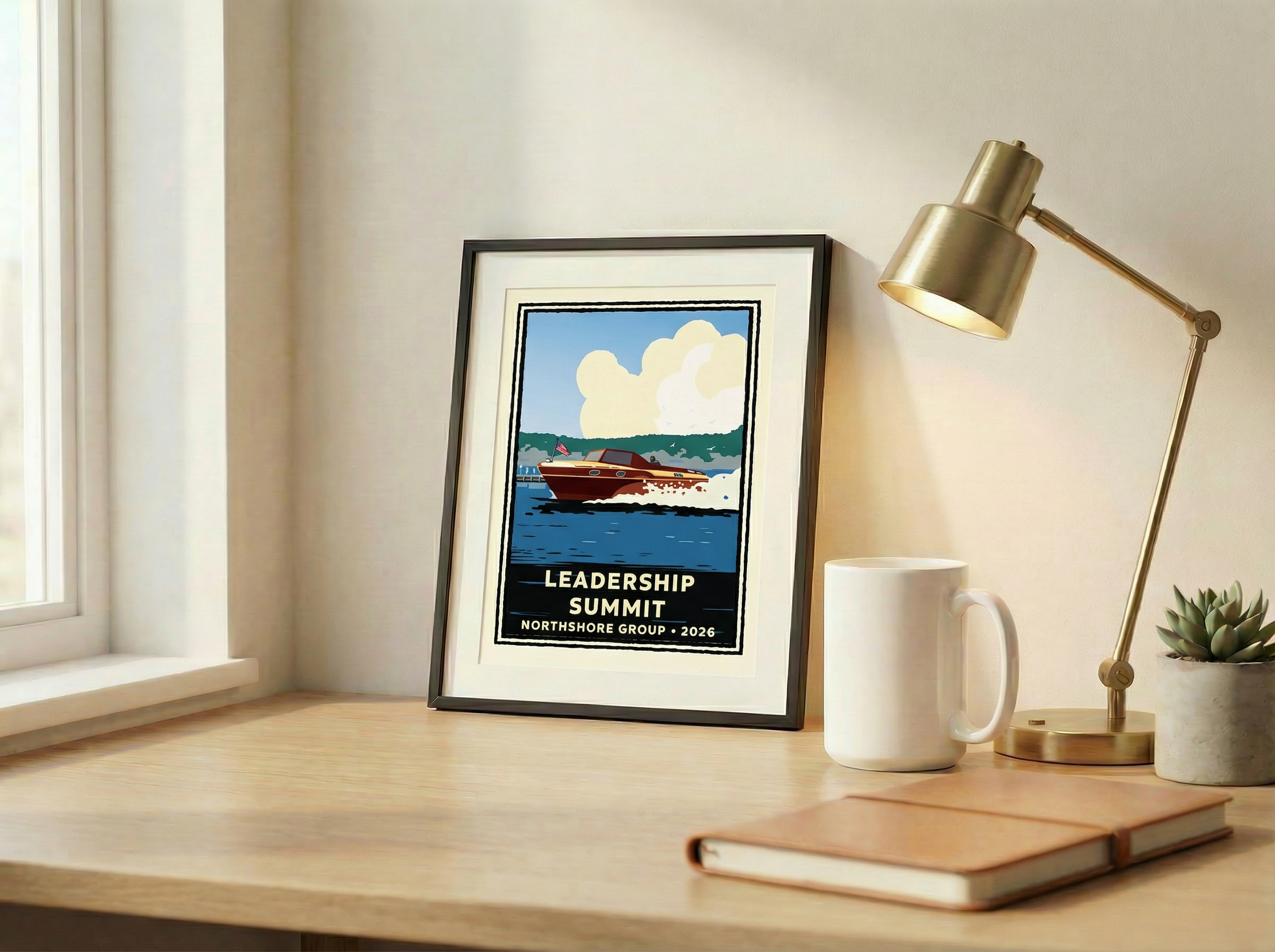 Classic Wooden Speedboat Corporate Event Print — Customizable (50+ Bulk Orders)